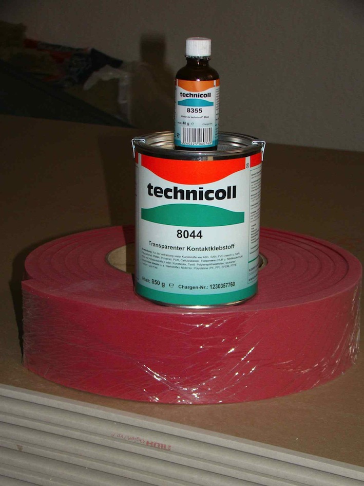 Alle Wände waren nicht mit dem Boden verbunden sondern verklebt mit sogenannten "Sylomer" Streifen (rot), die über Jahre hinweg eine Schalldämmung von ca. 30dB garantieren zum Boden hin. Die roten Streifen sieht man auf dem Foto jeweils unten hervorschaun. Das waren also unsere schwingended gelagerten Seiten Wände. Und so sieht das Sylomer aus, wenn man es kauft und den entsprechenden 2 Komponeten Kleber, der noch nach Jahren hält, dazu: