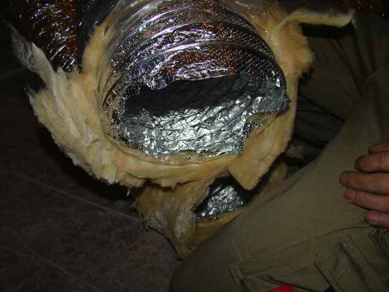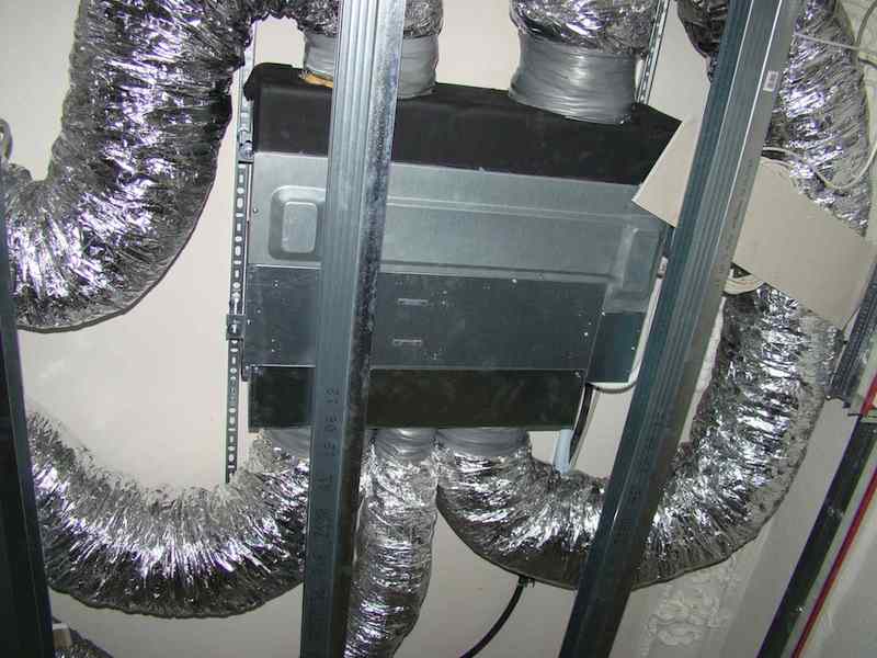 Die Inneneinheit hat einen Eingang vom Außengerät, mehrere weitere Schlauchein- und Ausgänge, 2 Luftausgänge und 2 Lufteingäne für die beiden Aufnahmekabinen und eine Zuleitung zur Fernbedinung. Der Luftstrom in den Räumen ist praktisch nicht hörbar, man spürt eben nur das Luft rauskommt. Nur im stärksten Modus sind minimale Geräusche zu hören. Die "Rohre" bestehen im Grunde aus Staniolpapaier mit Dämmwolle in 5 Schichten, dazu kleine Ringe zur Stbilität. Hier ein Foto davon: