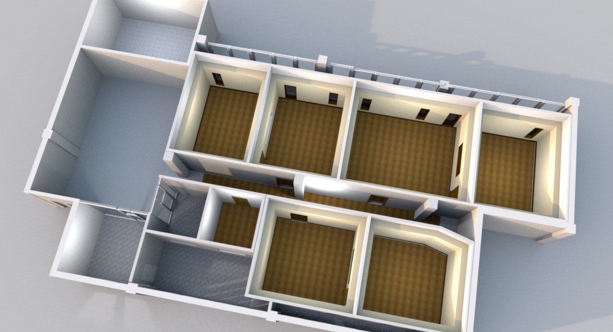 Abbildung 6 Hier die Räume in der modellierten 3D Ansicht. So lässt sich ein bisschen besser einschätzen, wie groß die jeweiligen Räume später aussehen werden.Die Wände haben jetzt auch die richtige "Dicke" inkl. Akustik Wände.