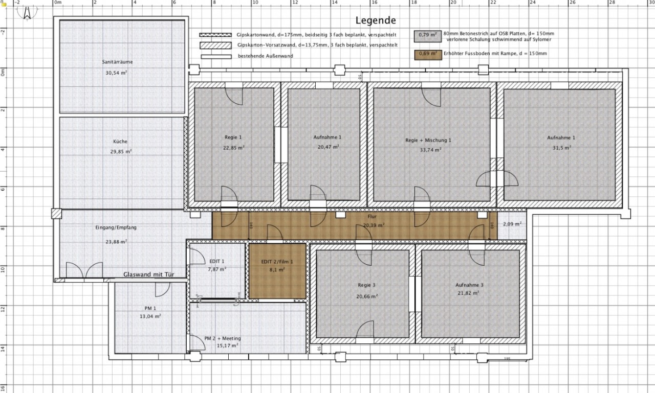 Jeder Raum soll als Raum-in-Raum-Konzept gestaltet sein, um größtmöglichen Schutz vor äußeren Schalleinflüssen zu haben. Mit einem Mindestmaß von 20m² pro Raum sind so bereits fast ein Drittel unserer Gesamtfläche verbraucht. Gedacht ist, dass alle Sprecher mit dem Rücken zur Regie positioniert sind, um eine maximale Textkonzentration zu gewährleisten. Außerdem sollten sich die Sprecher nicht von einfallendem Tageslicht gestört fühlen. Nun könnte man sagen dass es damit noch genügend Platz gibt und prinzipiell ist dem auch so doch es fehlen schließlich noch ein paar weitere Räume. Wo soll der Empfang hin, wo die Sanitärräume? Wie groß darf eine potenzielle Küche sein und wie sieht es eigentlich mit zusätzlichen Schnitt- und Arbeitsräumen allgemein aus? Sind alle Räume barrierefrei, gut zugänglich und im Brandfall richtig dimensionierte Fluchtwege vorhanden? Wieviel Platz bleibt nach Abzug der dreifachen Wände durch das Raum-in-Raum-Konzept? Und dann steht noch die Frage – die schwerste überhaupt – wie sich all diese Räume zusammen optimal auf der Gesamtfläche verteilen lassen.