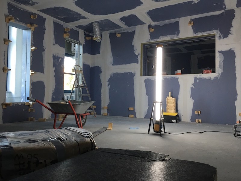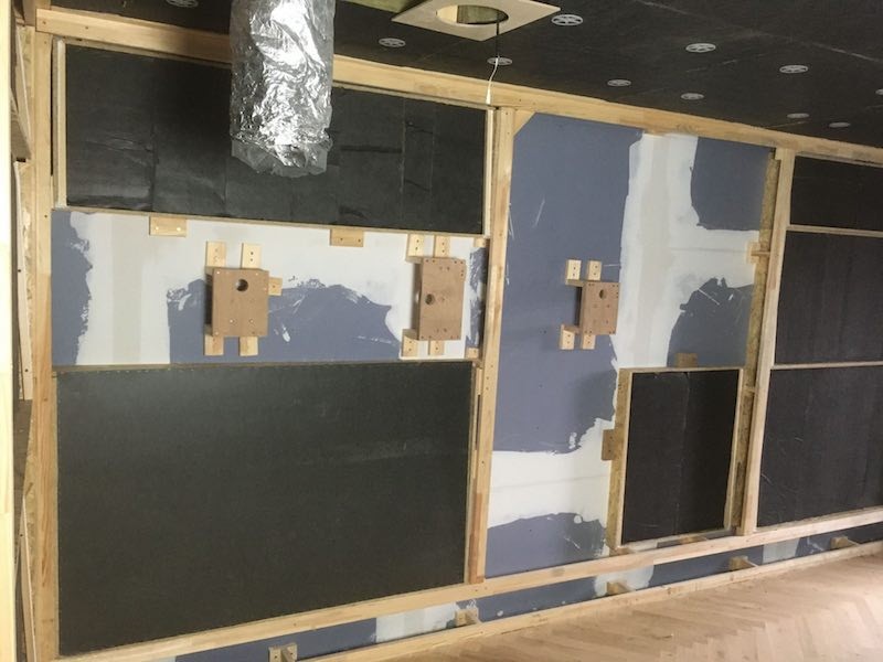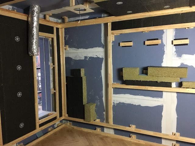 Begonnen haben wir mit dem Bau der Absorberwände in den Studioräumen. Dazu musste eine Holzlattung mit insgesamt 1,8 km Länge an den Wänden angebracht werden. Wir haben wohl knapp 700 Holzstempel gebaut, montiert und mit Verbindungslatten einen einzigen großen Käfig gebaut. Ein Teil der Zwischenräume wird anschließend mit speziell gefertigten Absorbern gefüllt, um Raummoden auszugleichen. Der Rest wird mit Steinwolle gefüllt.