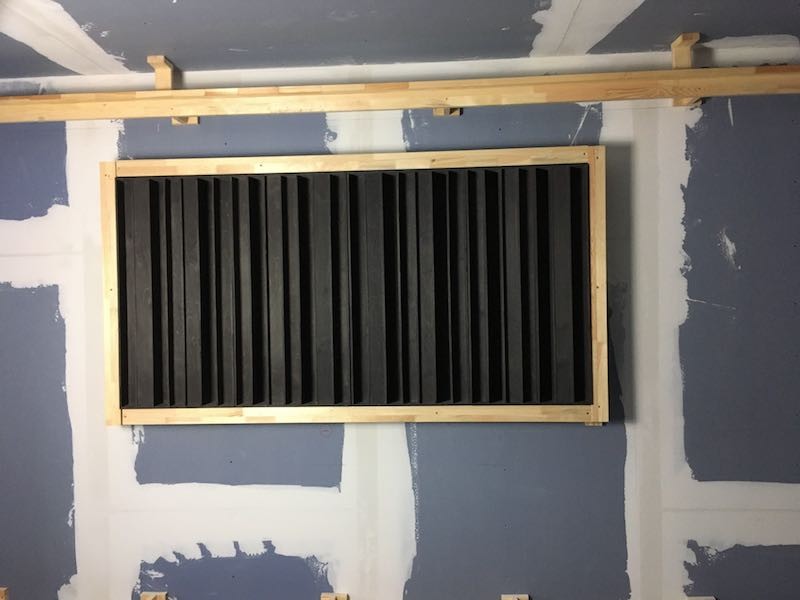 Bei uns kommt sie, neben der Dämmung, auch in den Absorbern zum Einsatz. Diese haben wir in zwei Varianten gebaut, welche sich bzgl. Ihrer Dicke unterscheiden – je nachdem ob wir eher Tiefen oder Höhen ausgleichen wollen. Parallel zu den Regiefenstern haben wir im Übrigen extra angefertigte Diffusoren angebracht.