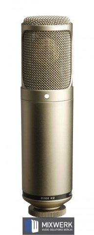 Le RØDE K2 est un microphone à condensateur haut de gamme avec diaphragmes plaqués or de 1". Une commande directionnelle en continu de l'omnidirectionnel à cardioïde à figure en 8 est possible au moyen d'un bloc d'alimentation.